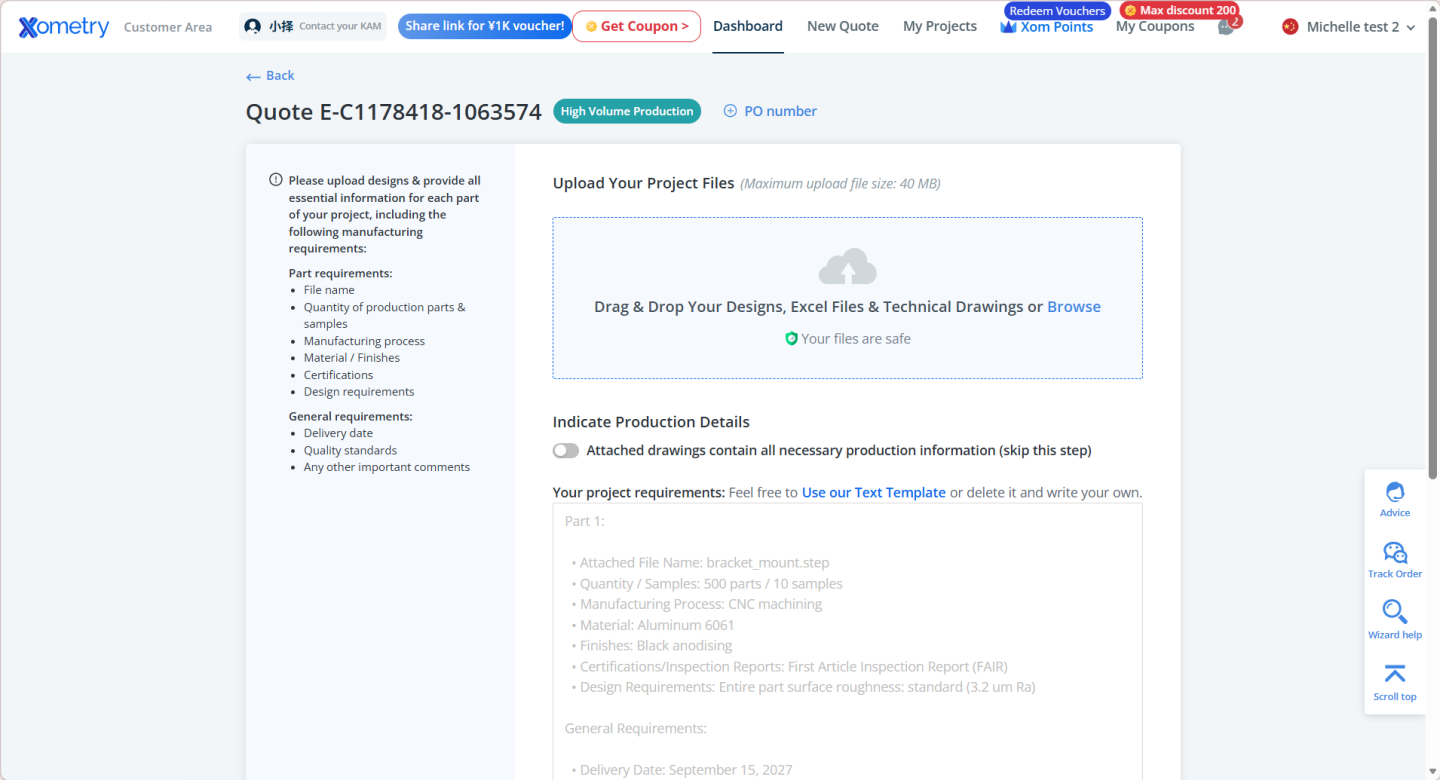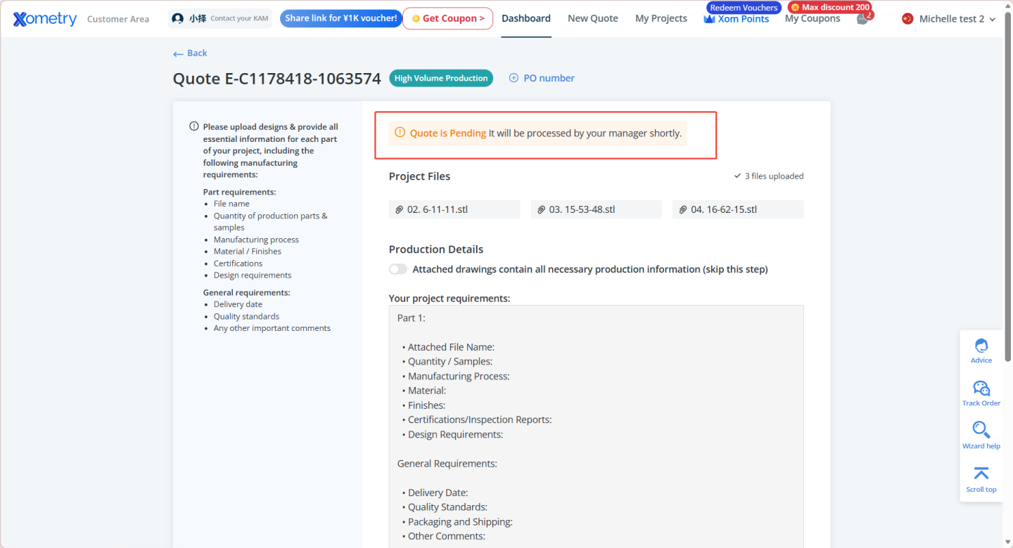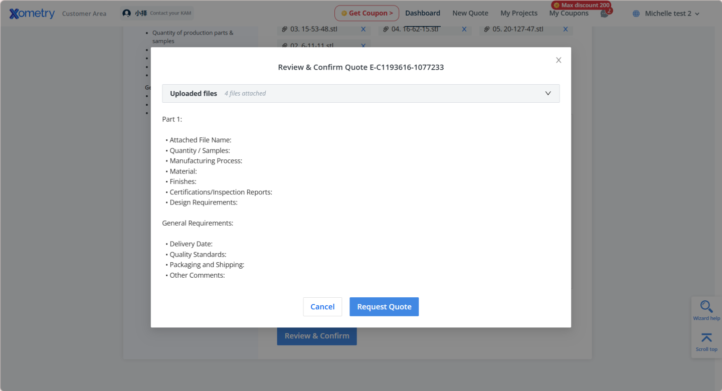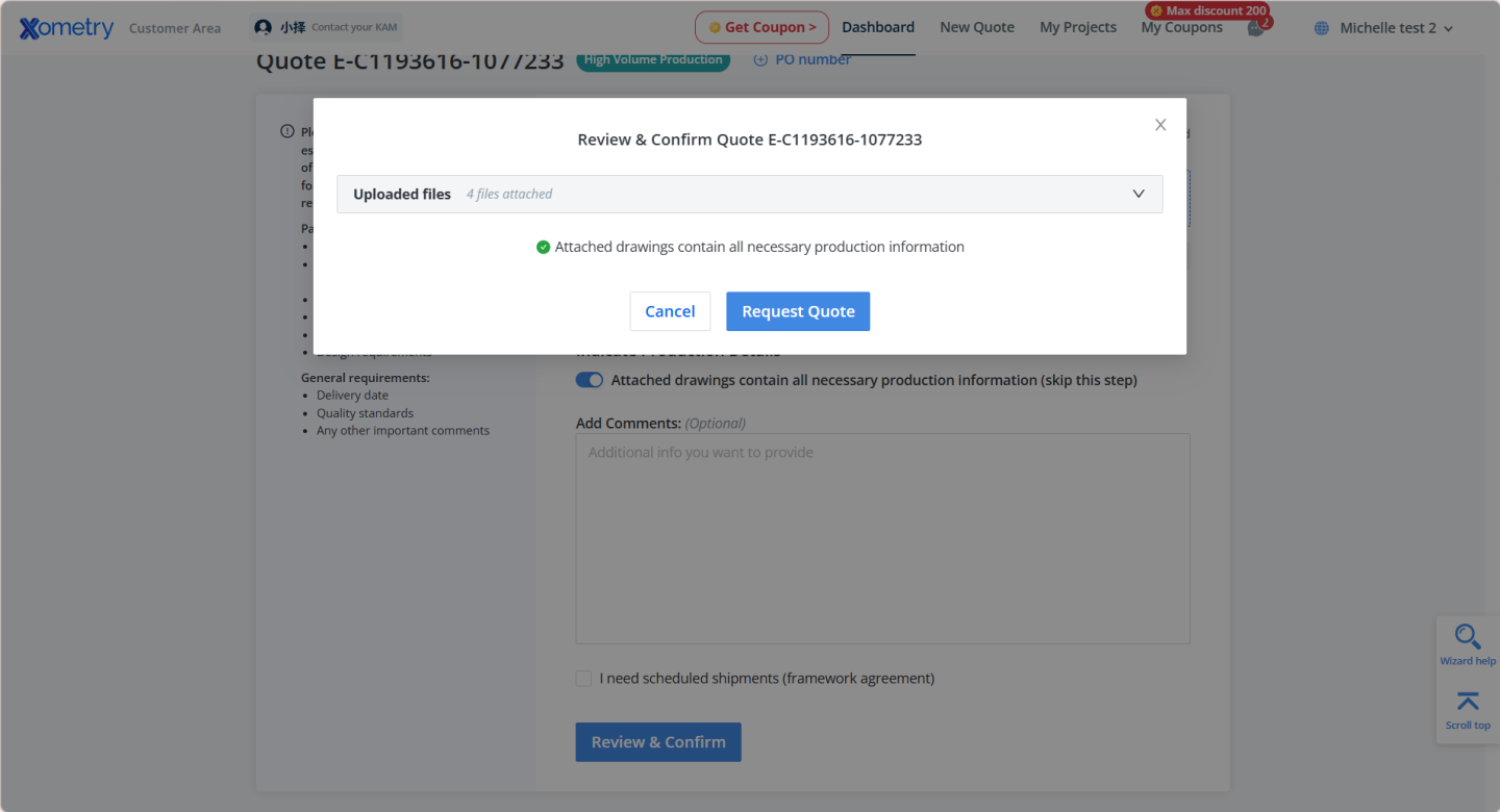 Then, click the "Start a New Manual Quote" button and upload your project files, such as CAD drawings, technical drawings, or Excel sheets, as shown in Figure 1-3.
