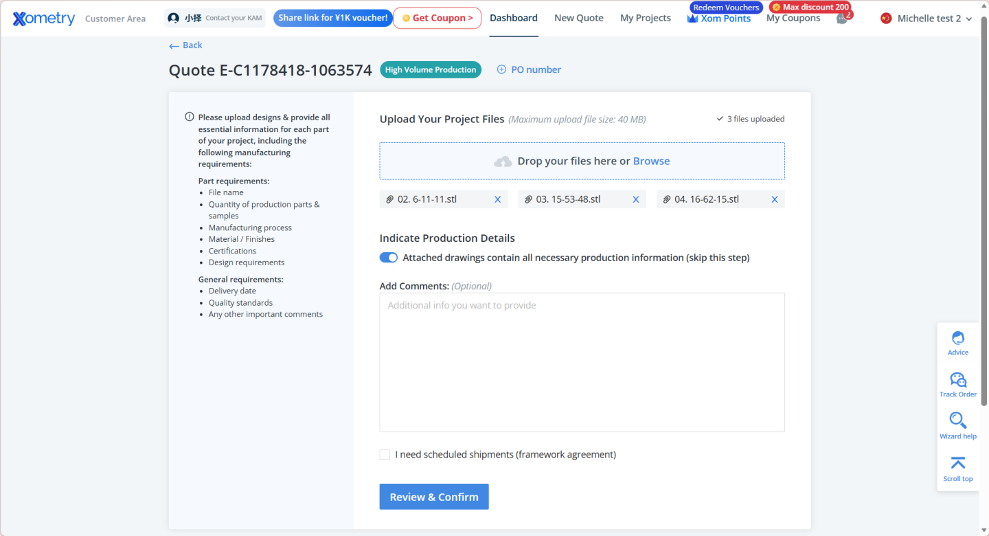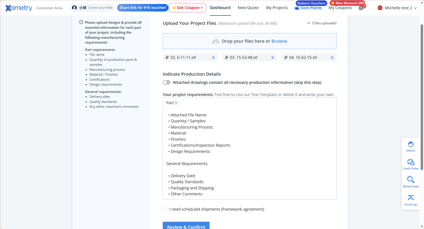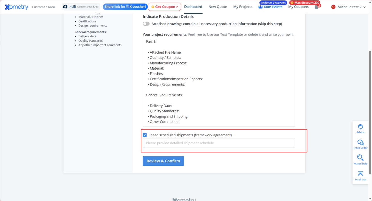 2. Specify project requirements: If your files already contain all production details, simply activate the relevant toggle and click "Review & Confirm" (see Figure 2-1). We will then immediately begin the quoting process based on your project specifications. If the information is incomplete, please provide additional production details in the "Your Production Requirements" text box (see Figure 2-2). You may use the template we provide or write your own specifications.