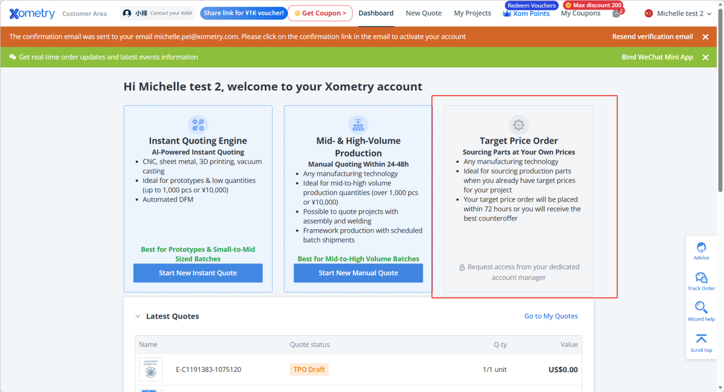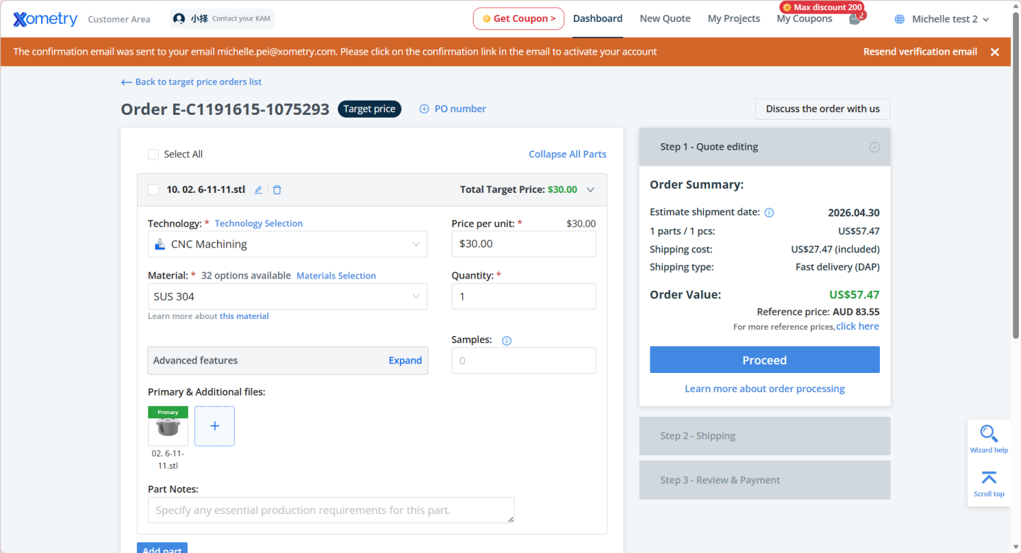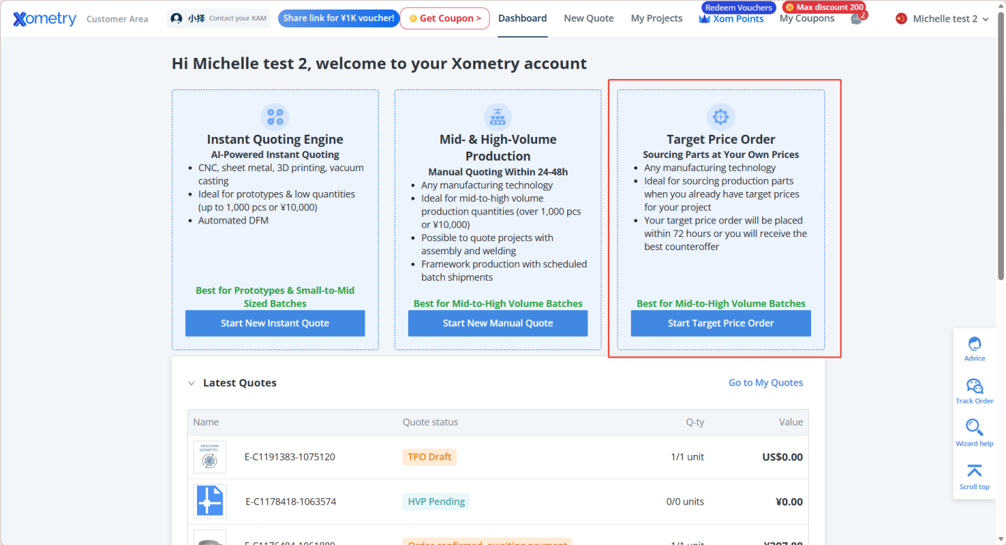 Once access is granted, you can click the "Start a Target Price Order" button, upload your design files, and set the material, quantity, and other key parameters. Then, enter your desired target price per unit — this is the core of the Target Price Order model, giving you precise control over procurement costs within your budget.