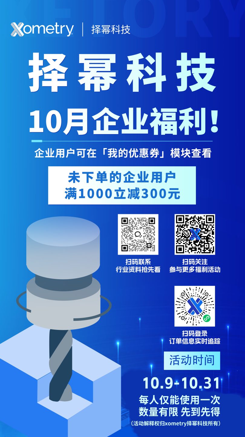 Xometry Asia · Oct 9, 2025 活动内容:符合条件的企业新用户登录账号后,可在【我的优惠券】模块查看优惠券。 活动工艺:不限 活动力度:满1000立减300元! 活动时间:10.9-10.31 福利活动限时专享!每张券每人仅可使用一次! 立即上传设计图纸,获取实时报价,收获心仪定制部件! (活动解释权归Xometry择幂科技所有)